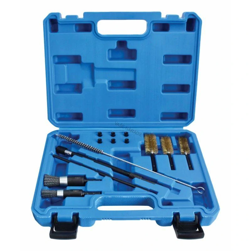 Sada SATRA obsahuje všetky potrebné adaptéry a kefy na efektívne čistenie vstrekovacieho otvoru a dosadacej plochy pred montážou nových vstrekovačov. Vhodná pre veľmi širokú škálu vozidiel a pomáha predchádzať spätnému prúdeniu v dôsledku zle usadených vstrekovačov. Sada obsahuje tri mosadzné oceľové drôtené kefy 18 mm, 22 mm, 25 mm a 1 x čistič dýzy vstrekovača z oceľového drôtu na čistenie uhlíkových usadenín z vnútorných bočných stien otvoru a dve 15/20 mm silikónovo-nylonové kefy na čistenie základne v oblasti dosadacej plochy vstrekovača. Silikónovo-nylonové kefy poskytujú hladký a konzistentný povrch hliníka, čo je veľmi dôležité v oblasti tesnenia základne, kde bežné oceľové drôtené kefy môžu poškriabať povrch, čo znamená, že oblasť dosadacej plochy môže byť potrebné prerobiť. Doplnkové: 224 mm bitový kľúč s rýchloupínacím skľučovadlom, 6 x tesniacich zátok portu, aby sa zabránilo vniknutiu uhlíka alebo nečistôt do spaľovacej komory počas procesu čistenia.